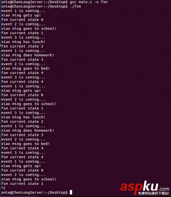 int main(){ FSM_t fsm; InitFsm(&fsm); int event = EVENT1; //小明的一天,周而復始的一天又一天,進行著相同的活動 while (1) { printf("event %d is coming.../n", event); FSM_EventHandle(&fsm, event); printf("fsm current state %d/n", fsm.curState); test(&event); sleep(1); //休眠1秒,方便觀察 } return 0;}看一看該狀態機跑起來的狀態轉移情況: