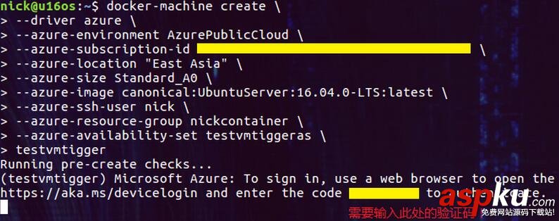 docker-machine create / --driver azure / --azure-environment AzurePublicCloud / --azure-subscription-id xxxxxxxxxxxxxxxxxxxxxxxxxx / --azure-location "East Asia" / --azure-size Standard_A0 / --azure-image canonical:UbuntuServer:16.04.0-LTS:latest / --azure-ssh-user nick / --azure-resource-group nickcontainer / --azure-availability-set testvmtiggeras / testvmtigger