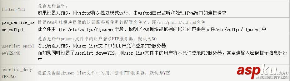 userlist_deny=YES/NO(YES) //決定vsftpd.user_list文件中的用戶是否能夠訪問FTP服務器。若設置為YES,則vsftpd.user_list文件中的用戶不允許訪問FTP,若設置為NO,則只有vsftpd.user_list文件中的用戶才能訪問FTP。