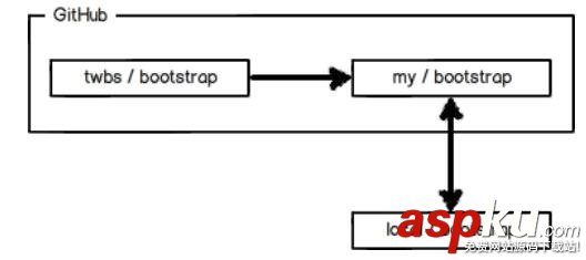 Bootstrap的官方倉庫twbs/bootstrap、你在GitHub上克隆的倉庫my/bootstrap,以及你自己克隆到本地電腦的倉庫,他們的關(guān)系就像下圖顯示的那樣: