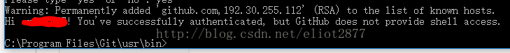 添加好以后,使用命令ssh -T git@github.com測試,如果返回信息正確,說明設置成功