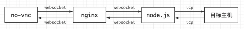 整體思想如下圖所示:nginx轉發前臺的websocket連接,為了實現外網轉發,添加開發的node.js服務器作為代理,將瀏覽器端no-vnc的websocket數據報在運輸層轉發給目標主機。