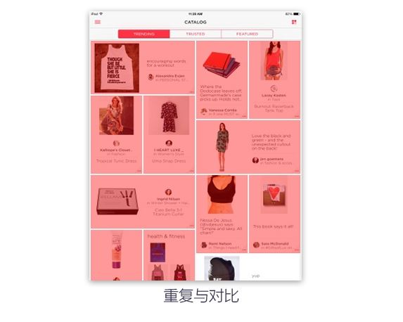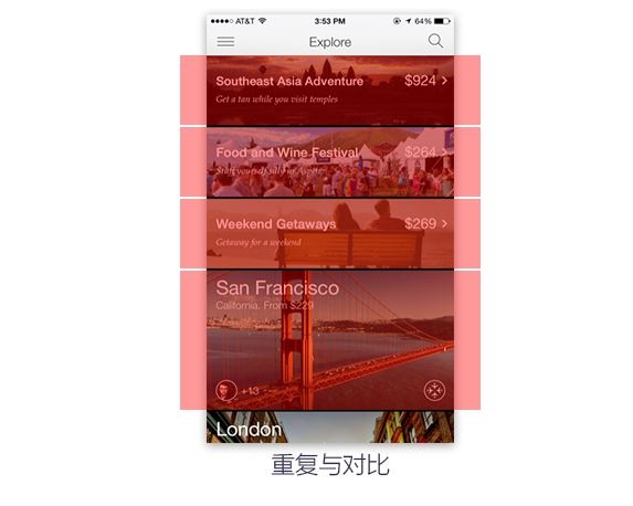 設計和做其他事情一樣,也要有輕重緩急之分,不要讓用戶去找重點/需要注意的地方,應該讓用戶流暢地接收到我們想要傳達的重要的信息。重復和對比是一套組合拳,讓設計中的視覺元素在整個設計中重復出現既能增加條理性也可以加強統一性,降低用戶認知的難度。那么在需要突出重點的時候就可以使用對比的手法,例如圖片大小的不同或者顏色的不同表示強調,讓用戶直觀地感受到最重要的信息。