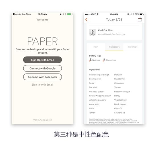 第四種是中性色配色,用一些中性的色彩為基調搭配,弱化干擾。這種方法在移動端是最常見的方法。