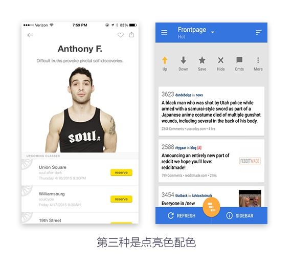 第三種是點亮色配色,主色用相對沉穩的顏色,點晴色采用一個高亮的顏色,起帶動頁面氣氛,強調重點的作用。