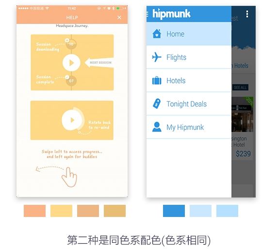 第二種是同色系配色(色相一致,飽和度不同),主色和點晴色都在統一的色相上,給用戶一種一致化的感受。
