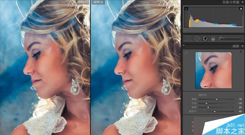 在右邊的操作欄,我們可以看到細(xì)節(jié)的選項(xiàng),增加銳度,減少雜色,讓模特兒皮膚更平滑(類似簡單的磨皮效果),如果個(gè)人不喜歡這種質(zhì)感則完全可以跳過。
