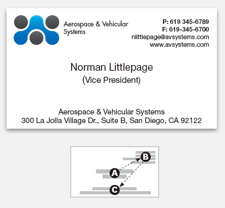 將相關的文字元素且合起來,立即就產生了一種清晰的閱讀效果,現在名片上的聯系信息能夠輕松地讓人從上到下觀看。上面豎版的排列中,標志形成了一個視覺焦點,所以我們的眼睛首先會移到上面觀看,然后很自然地由上到下地閱讀下面的聯系信息。