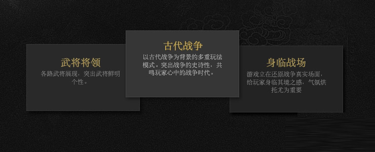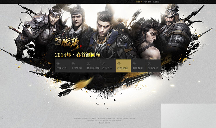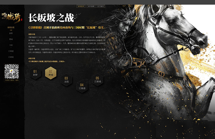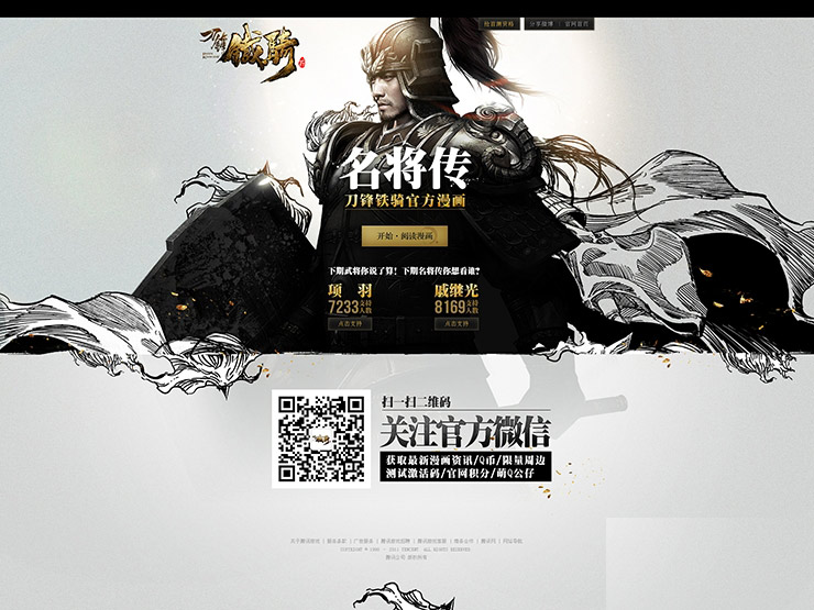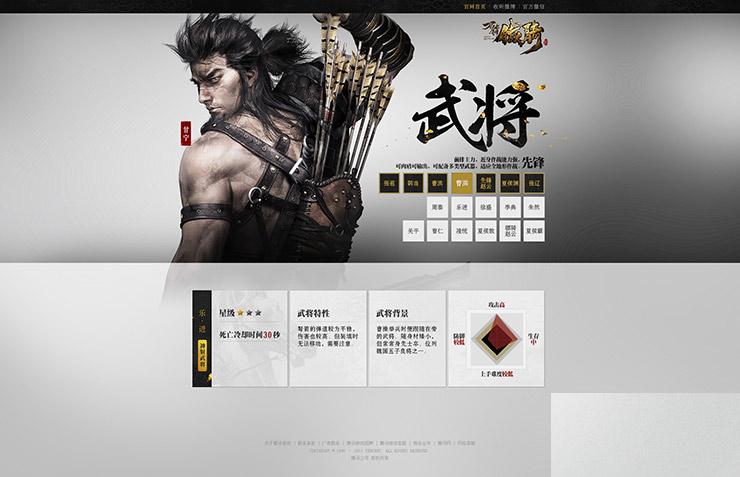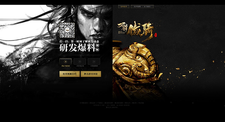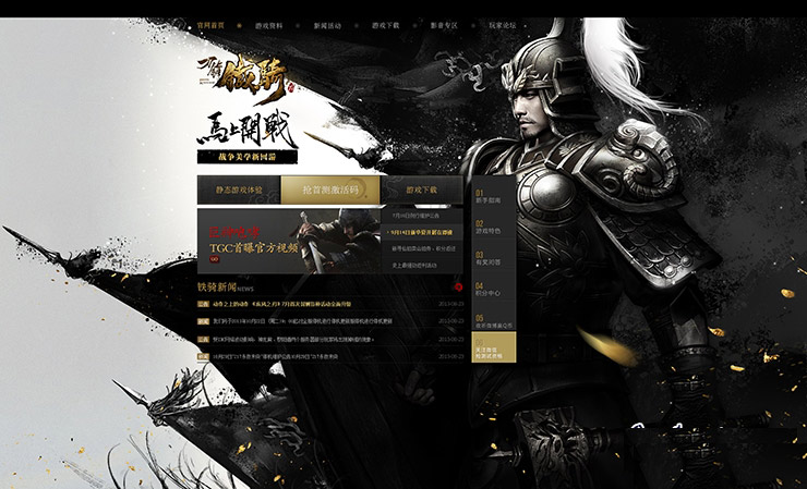 官網首頁在設計中沿用黑金兩色,2D黑金元素配合3D武將,營造出置身戰場的意境。厚重鎧甲和反復元素的背景前的是簡單純粹的UI讓用戶在各種視覺表現中也不會丟失交互重點。