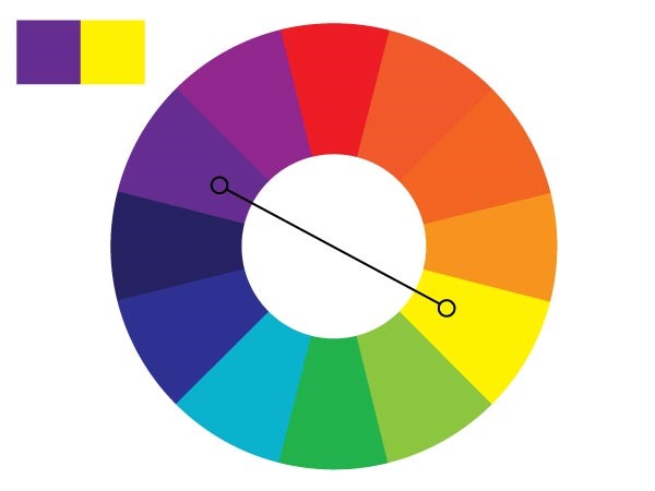 分散的互補色和互補色的區別在于分散的互補色并不是取目標顏色正對面的顏色。拿上面的圖做例子來說吧,黃色的互補色應該是紫色,但是我們取紫色旁邊的兩個顏色——紫紅色和藍紫色。這樣子不僅可以有一個強烈的對比度,而且還可以讓顏色更豐富。