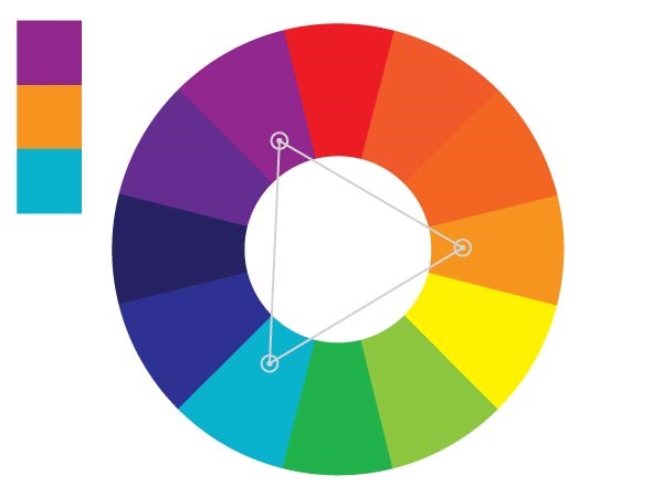 三角色也是一組顏色。是通過在色環上創建一個等邊三角形來取出的一組顏色,可以讓作品的顏色很豐富。在上面的例子中,藍紫色和黃綠色就可以形成十分強烈的對比。