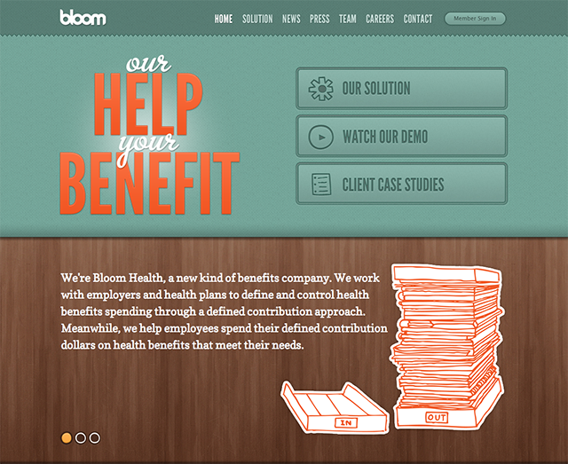 網(wǎng)站頁面運(yùn)用了色塊“拼接”的效果,從白到灰再到綠色。白色和灰色都是中性色,所以頁面中的綠色很自然的成了最搶眼的一部分,這樣的搭配方式也讓畫面更富有運(yùn)動感。
