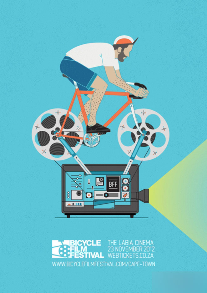 二逼青年歡樂多,請盡情玩轉海報關鍵詞,使用出人意料的圖片。當然,正式主題內容除外。下方的單車電影節海報大可選用各類其它或活潑或新奇的風格,但設計師選用了幽默法來表達,這不禁讓讀者們心里長草,去要一探究竟。