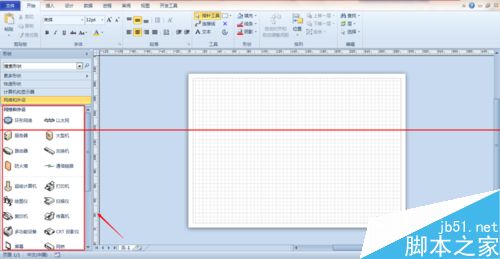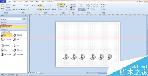 4、接下來開始繪制網(wǎng)絡拓撲圖了,首先點擊左側(cè)的形狀列表,找到計算機和顯示器形狀,將圖形拖到繪圖面板,作為網(wǎng)絡設備,如下圖所示。