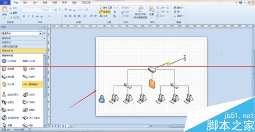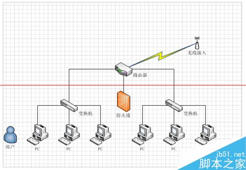 5、然后在圖形里繪制交換機,路由器,防火墻,無線接入等設備,并用連接線連接,如下圖所示。