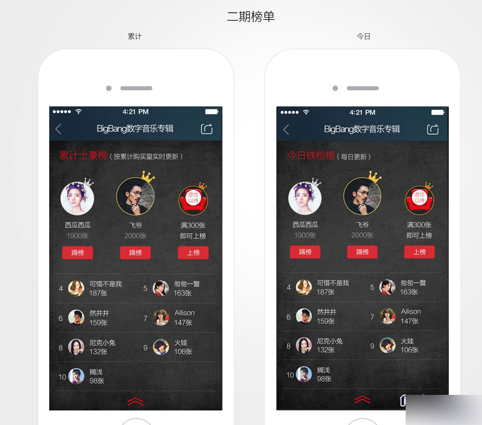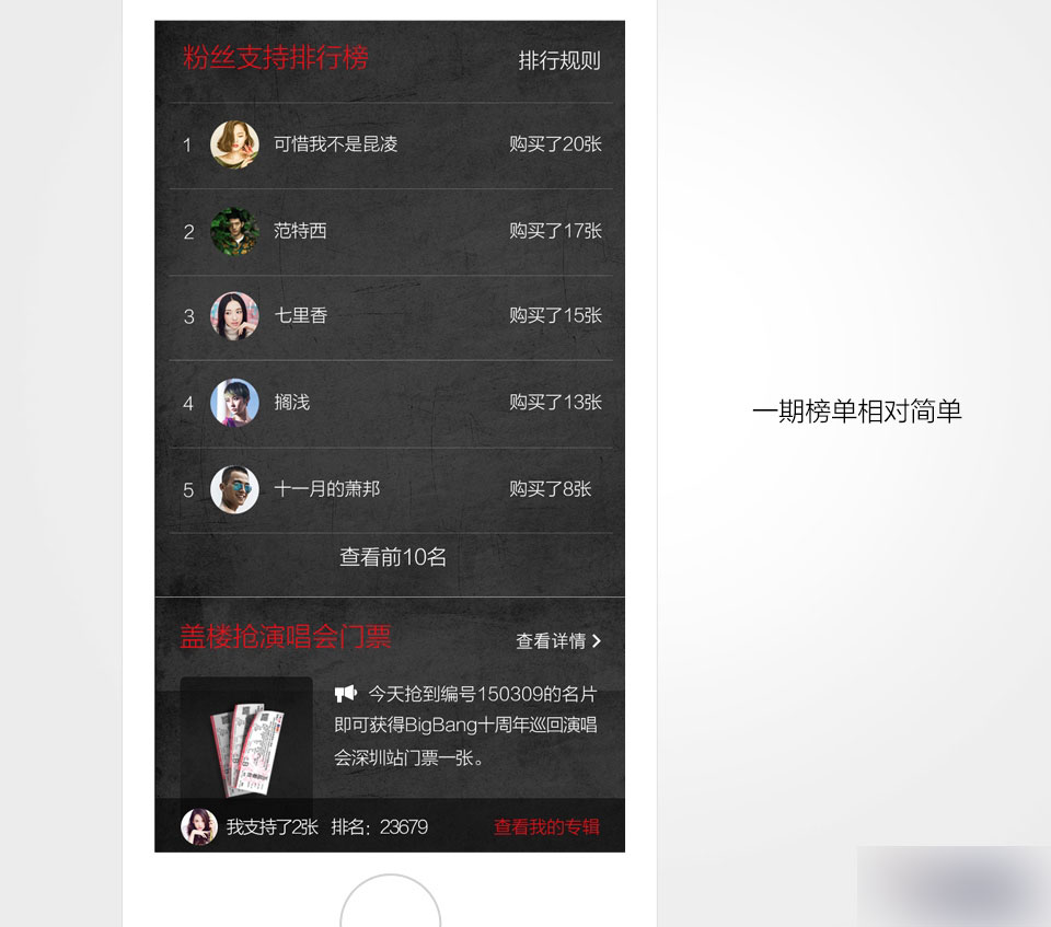 在BigBang的mini專輯一期,粉絲榜還是相對普通的排行榜,到了二期,我們將排行榜進行了一輪優化。