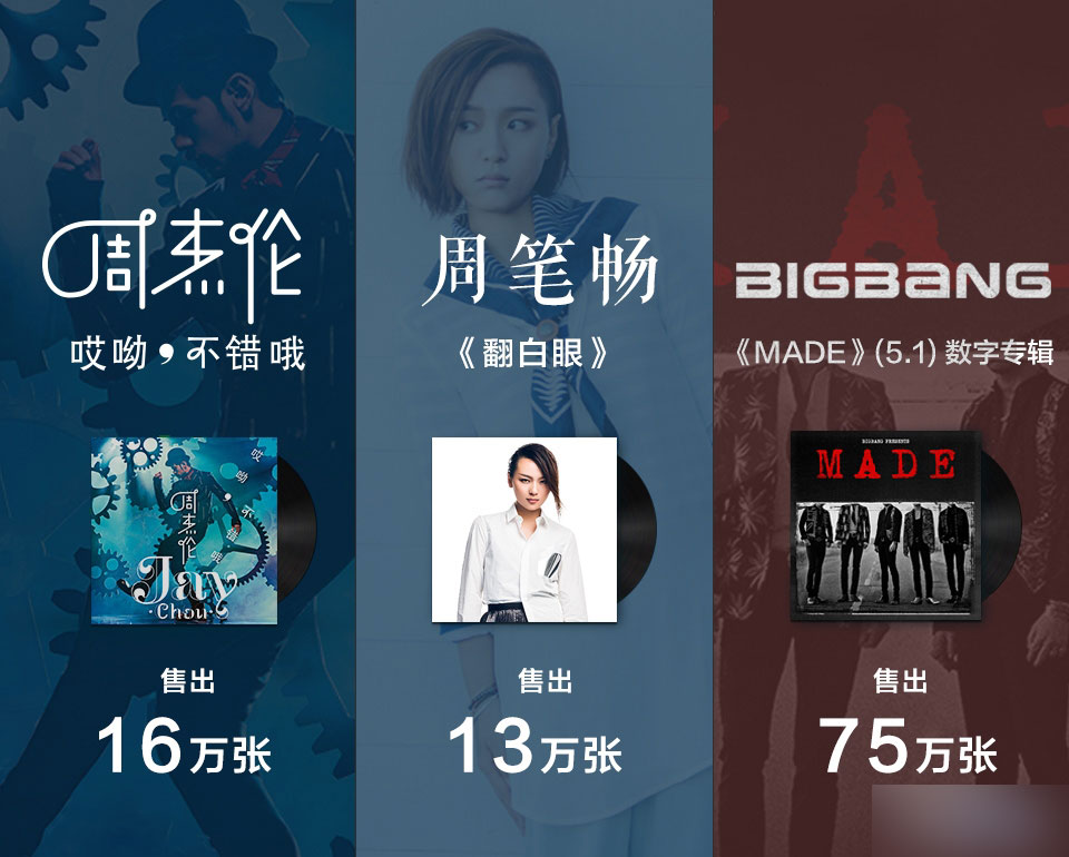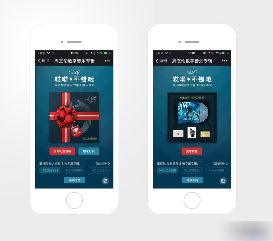 模版化周杰倫數字音樂專輯只是開端,為了應對更多的數字音樂專輯的售賣,我們將活動流程規范化,頁面的設計模板化,以節省人力成本。經過了蘇打綠、bigbang、周筆暢等多張數字音樂專輯的慢慢調整, 數字專輯售賣的模塊已經基本完成模板化。當然,為了迎合各類粉絲的喜好以及不同專輯的風格,每個專輯的禮盒,在保持一致性的同時我們會做一些差異化的設計,使每個專輯能有自己的特色。