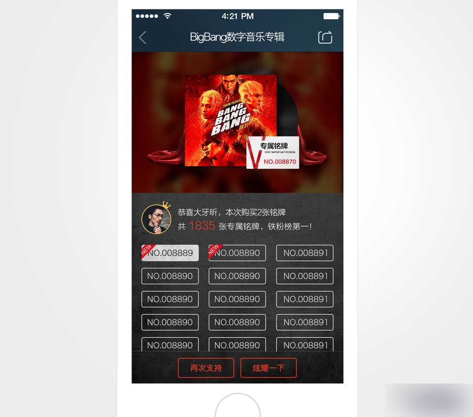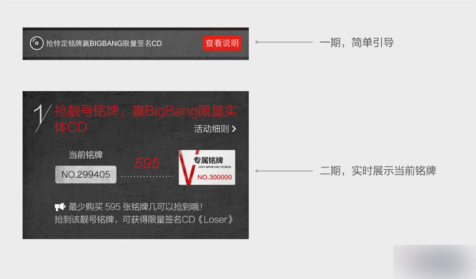在BigBang的mini專輯一期時,搶靚號銘牌還只是一個小小的引導,在二期,我們將這個優化為一個欄目,實時展示當前號碼,以及距離靚號的張數,幫助用戶判斷購買時機,刺激土豪用戶購買。
