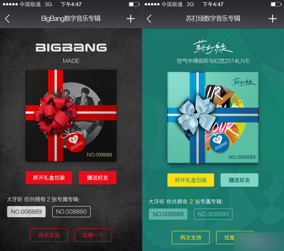 專屬銘牌是為了刺激用戶購買包裝的概念。這個概念最原始的來源是,我們把購買專輯包裝為對明星的一種支持,那我是第xxx位購買的用戶,我就是第xxx位支持明星的人,這個是粉絲們樂意去炫耀的。