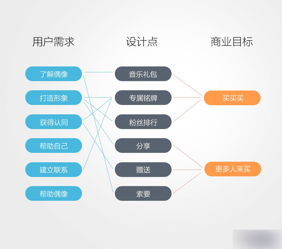 在整個項目里面,其實貫穿始終,都是希望通過設計,讓用戶能夠接受付費音樂這件事情,如何讓他們接受呢?最直接有效的方法就是從他們的原始需求出發。在確定了從粉絲群體切入之后,我們和用研同學一起做了一次腦暴,針對粉絲用戶的需求發散出一些設計點,應用到了項目中。整體思路可以用下面一張圖來總結: