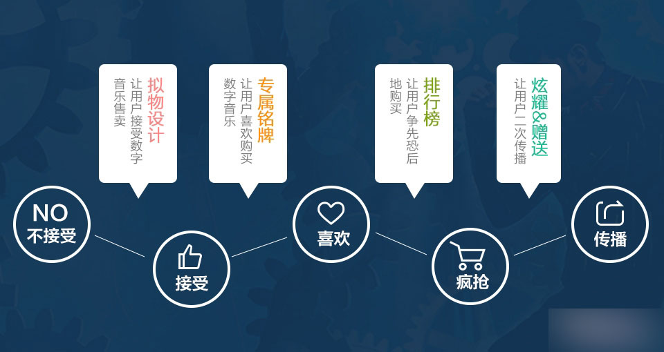 設計思路要讓用戶心甘情愿付費,我們必須從用戶的角度思考,挖掘用戶付費的原始需求。結合用研同學對粉絲心理的研究,我們做了一系列的設計,讓普通用戶從心理上接受數字音樂的售賣,粉絲用戶會樂于購買,重度粉絲用戶瘋搶,一些用戶主動傳播。