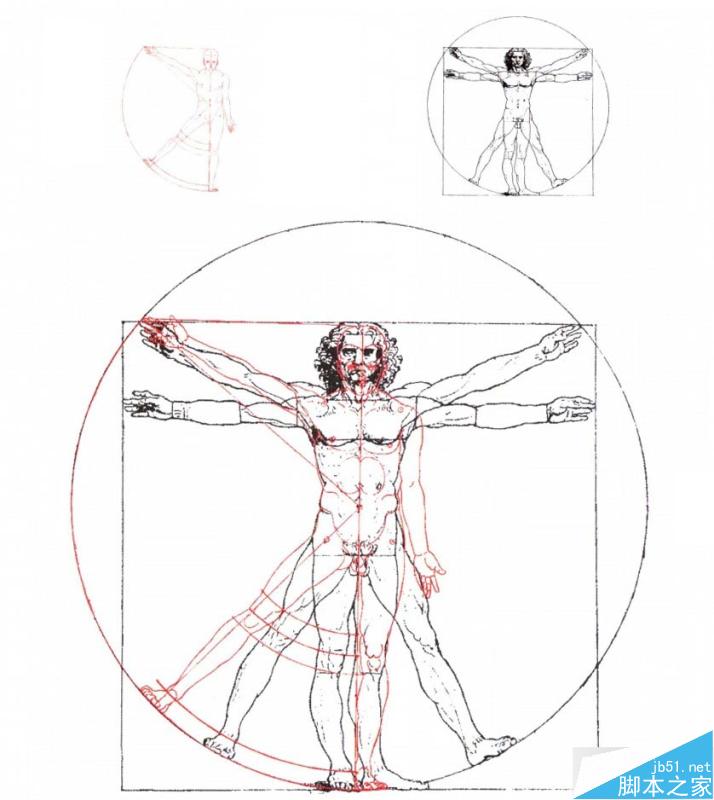 人體也具有同樣的完美比例,人體的高度與伸展開的手臂形成了一個正方形將人體圍住,而手和腳正好落在以肚臍為圓心的圓上,肚臍位于黃金分割點上,這在文藝復興時期的藝術家萊昂納多·達芬奇和丟勒的《完美的比例》《人體比例四書》也都有所體現。