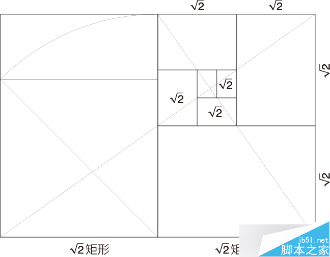 人類從黃金分割率中提煉出的√2矩形也具有許多特殊的性質,能被無限的分割成更小的等比矩形,其長寬比也相當接近黃金分割率(1.414與1.618)