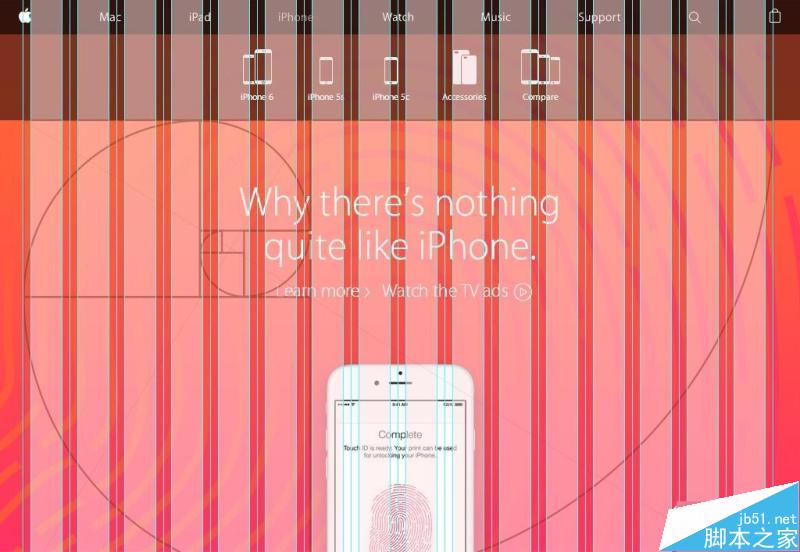 iPhone6官網不僅用到了網格系統,同時也應用黃金分割率確定文字、圖片與連接的間距,讓整個頁面看起來簡潔且合理。