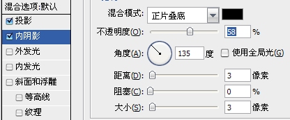 在上面的圖片中我為大家指出了各個圖層樣式作用的區(qū)域,在運用到的圖層樣式中,內(nèi)陰影可以說是最為"本分"的,它也恰如其分地營造出一種陰影的效果,在這里我只是稍微降低了透明度,使得陰影不至于太暗。因為假定光線是從左上方照射下來,因此,我把角度修改為135°。為了使得陰影只投射到文字輪廓的邊緣,而不是填充了整個文字的輪廓,因此我把距離和角度都降低到3像素的大小(具體數(shù)字要依據(jù)實際文字的尺寸和筆畫粗細來定)。具體參數(shù)如下