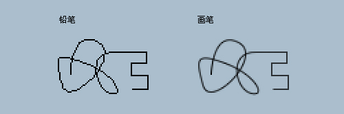 明白了它的構成,那它做起來也就簡單了,方法有很多。你可以分別用矩形選框工具框選兩個寬為一像素的長條區(qū)域,然后分別填充深色和淺色。還有一個更為簡便的辦法就是,你可以用直徑為一像素的鉛筆工具來繪制。那么為什么要用鉛筆工具來繪制呢?如果你對鉛筆工具已經(jīng)很熟悉的話,那么大可以跳過這段了。鉛筆工具同其他繪圖工具相比,它的顯著特點就是保留鋸齒,它的筆觸是干凈利落的,介于筆觸的有和無之間不存在一個中間地帶,而畫筆工具的邊緣則是柔和的,過渡平緩的。如果這段敘述不夠直觀,那么請看下圖