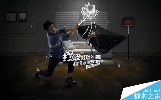 三組照片,不同動作。用夸張的表現形式強調體感操作的特點。隱喻我們的游戲畫面很好很逼真,很容易讓人身臨其境,告訴玩家玩游戲時候不要太入戲,小心你的電視屏幕。