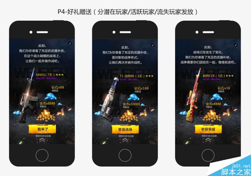 新人的是一個剛加入的狗牌,流失用戶與活躍用戶都是有等級的徽章(等級是拉取到游戲里的數(shù)據(jù)相互匹配的),為什么會設(shè)計這一個徽章的環(huán)節(jié)呢,因為其實只要是玩家都會對自己的一個數(shù)據(jù),又或者是稱號榮譽(yù)很是在意,榮譽(yù)感對于一個FPS的玩家來說就像是一個真正的士兵得到了嘉獎一樣。所以我們調(diào)用了游戲的數(shù)據(jù)來針對發(fā)放玩家相對應(yīng)的等級稱號。強(qiáng)化游戲特性,體現(xiàn)游戲的真實感,從而觸達(dá)玩家繼續(xù)喜歡這款游戲。