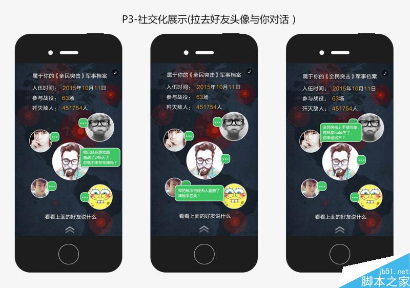 方向2:社交化:運用游戲的故事+社交(強(qiáng)關(guān)系鏈),千人千面的社交化表現(xiàn),敘述一個號召你加入戰(zhàn)斗的故事;(洞察:玩游戲最好玩的是什么?是能和朋友一起玩,一起吐槽...所以我們運用朋友的這個關(guān)系,做一個強(qiáng)關(guān)系鏈的互動,表達(dá)出"我們那么多人都來玩了,你怎么還不來玩呢?"的一個拉人的情景,激發(fā)他也加入游戲,從而達(dá)到拉新進(jìn)的目的。這就是人人都玩,我也要玩的心理打法)。