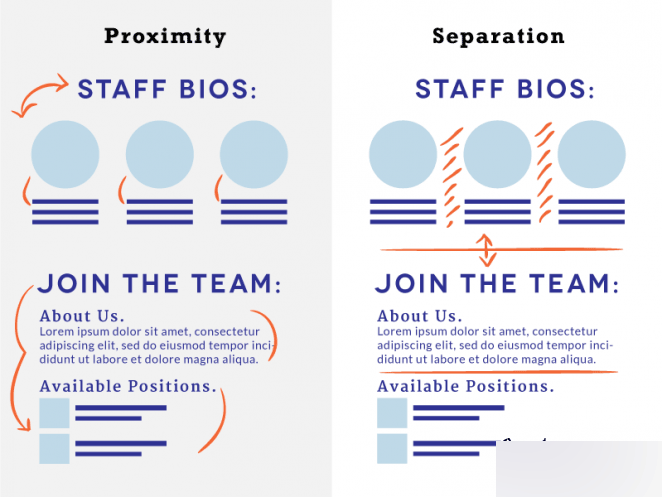 通過靠近分組的方式來組織內(nèi)容也是一種常見的設(shè)計(jì)技巧,可以更加便于瀏覽,更清晰地分割內(nèi)容。通過這種方式劃分出群體和個(gè)體,這也是一種沖擊力。