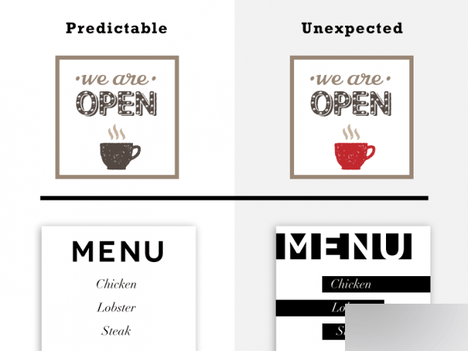 出乎意料的設(shè)計(jì)很多時(shí)候非常有效,因?yàn)樗屓烁与y忘。突變、不集中、不典型都是意外的特征。充滿驚喜的元素會(huì)讓設(shè)計(jì)內(nèi)出現(xiàn)前后沖擊力。意想不到的色彩和圖形都是這樣的設(shè)計(jì)。