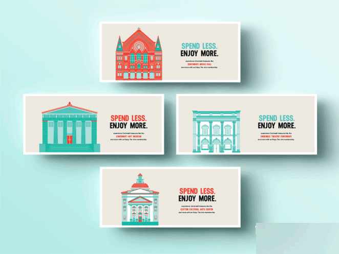 案例中是一組辛辛那提的明信片設(shè)計(jì),雖然整個(gè)建筑物是明信片中最大的視覺元素,但是哪些"Enjoy More"的文字在視覺上更加突出,那就是視覺重心。