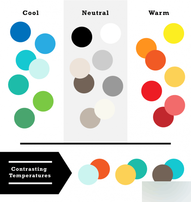 色彩都有著不同的色溫,黑白灰是中性色(米色和棕色有時(shí)候也會(huì)被歸類與中性色),紅色、橙色是暖色調(diào),藍(lán)色、綠色是冷色調(diào)。不同色溫的色調(diào)在一起的時(shí)候能夠形成不錯(cuò)的沖擊力。