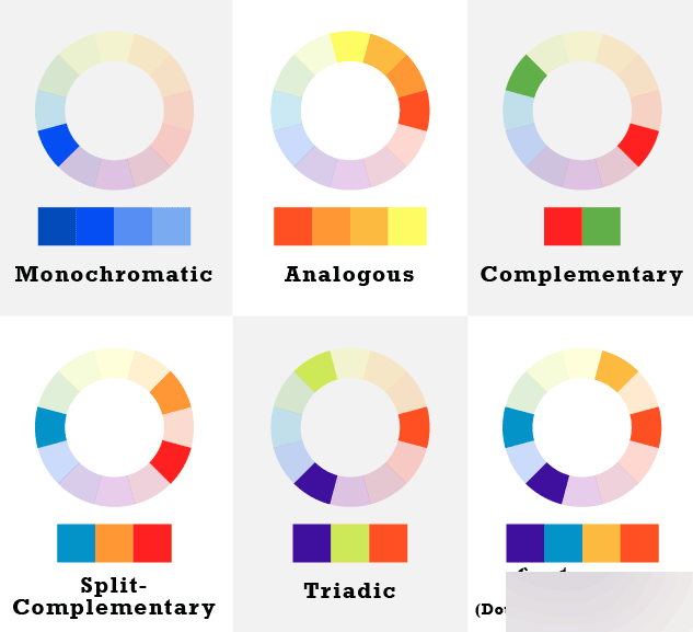 傳統(tǒng)的色輪上有12種色彩,但是常用的配色方案有很多,系統(tǒng)的配色理論中對(duì)于如何借助色輪來創(chuàng)建配色方案有比較系統(tǒng)的介紹,比如大家所熟知的單色方案、相似色方案、沖擊力色方案、對(duì)稱三色方案等等。在諸多配色方案中,有一些沖擊力非常高的配色方案,比如: