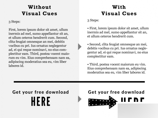 研究表明,人能記住他們所看到的80%的內(nèi)容,這也是為什么設(shè)計(jì)是強(qiáng)大的工具。但是用戶需要適當(dāng)?shù)囊曈X引導(dǎo)來找到重要的內(nèi)容。所以,視覺引導(dǎo)很重要,通過圓點(diǎn)、箭頭、下劃線等多種方式來區(qū)分內(nèi)容的重要性、條理性。而下面的案例也正是這樣做的。