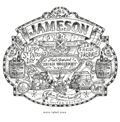 酷愛手繪字體設計和傳統繪畫,多才多藝的設計師和插畫家Steve Simpson受Jameson Irish Whisky委托創作第五代限量版瓶子的設計。"我們經歷了很多的草圖和調整,但他們對我的原創想法非常敏感,"辛普森談到他的工作過程。"他們只需要我想出一些能體現我對家鄉都柏林的感情的東西,成果要看起來像Jameson的出品,但同時也想讓它看起來像一個我個人的作品。