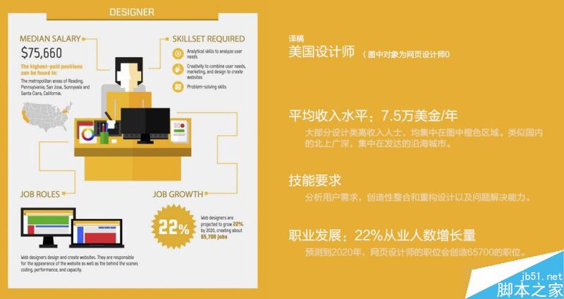 設計師工資最高的地區聚集在雷丁、賓夕法尼亞州、圣何塞、森尼維耳市和加州圣克拉拉的大都會地區。設計師需要具備分析了解用戶需求的分析能力;結合用戶需求、營銷和網站設計來進行創造的能力,還有問題解決能力。預計到了2020年Web設計師將增長22%,創造出65700個崗位。