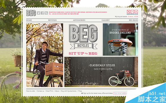 4.Beg Bicycles網站在不同位置使用了多種字體,logo、導航、圖片里的文字等,這些文字并沒有讓網頁布局顯得混亂,反而引導用戶的視覺有層次地展現不同板塊的內容,營造出清新和淡淡的復古感。
