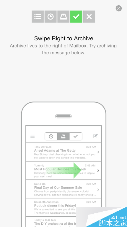 記得住左右輕掃的手勢在Apple的Mail APP里和在MailBox里的不同嗎?看看他們的逐步引導是如何做的:用戶們在開始使用APP之前,必須在APP所提供的一個練習場景里嘗試使用這個APP里的每一個手勢。