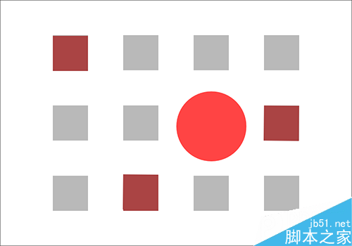 矩形中有三個矩形也是紅色的,雖然不是鮮紅(和圓比起來)。圖片中紅色的矩形和灰色的矩形在尺寸上都是相同的,但由于顏色不同,紅色矩形相比灰色矩形更為顯眼。