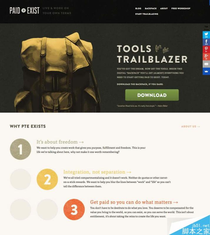 在Paid to Existde的網站首頁主導元素是頁面中的雙肩包圖形。它比周圍一切元素都大。由于背包的特點和與眾不同的形狀與周圍的所有環境形成了鮮明的對比。