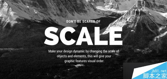 將字體、形狀等需要強(qiáng)調(diào)的內(nèi)容放大。適當(dāng)?shù)卮钆渖剩屝枰獜?qiáng)調(diào)的部分看起來巨大醒目,在這個(gè)案例中,我用Releway 字體來呈現(xiàn)"Scale"這個(gè)詞,因?yàn)檫@個(gè)字體更加敦實(shí)、清晰,放大后看起來體積感十足。