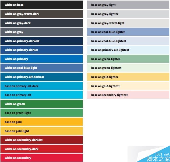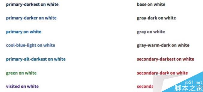 (下圖是引用了美國網頁設計規范中的視覺某部分,由于Web規范顏色有上百種,我們不可能一一記住,我們只需要熟悉這幾種常用的色彩,有一個感覺,背景色和文字色,那我們在配色的時候也可以直接引用,我們只要記住了這些常用色在色板中的位置,它的明度和飽和度的差異,那我們很容易直接調用它們。)