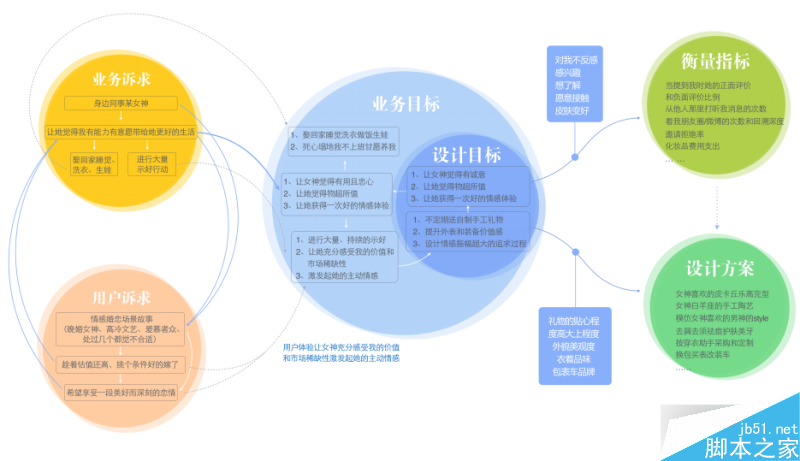 下面以一個思考如何追求身邊女神的案例試著通跑一下五導家。在這個案例中,為了模擬現實中團隊協作的情況,需要讀者自行人格分裂一下,你的下半身變成你的業務伙伴,是提出業務訴求的主體。而上半身則需要保持你的設計師身份。案例過程中,你需要重點考慮的是,作為上半身的設計師如何幫助全部的你追到女神。當然,這個比喻型的案例重在意會,幫助大家進行方法嘗試,并不建議作為實際工作中的參考范例。(圖8)