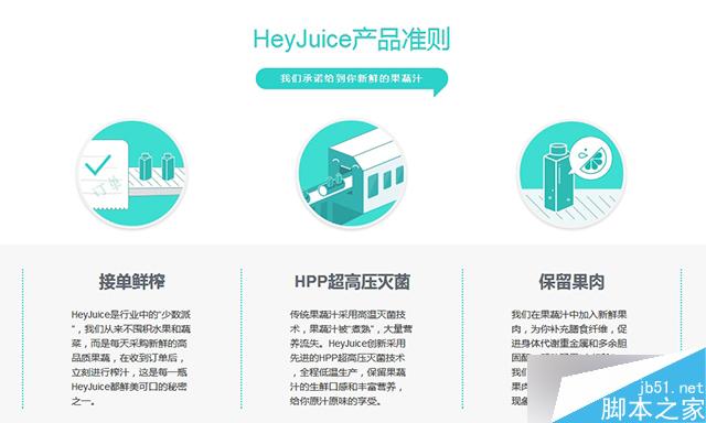 比如HeyJuice網站在產品準則部分采用了統一的"圖片+標題+正文"形式。內容不同,而布局方式統一,圖片風格一致。用戶一眼看過去,就能知道這是屬于同一個版塊的內容,這樣的重復很容易有一種連貫、平衡美感。