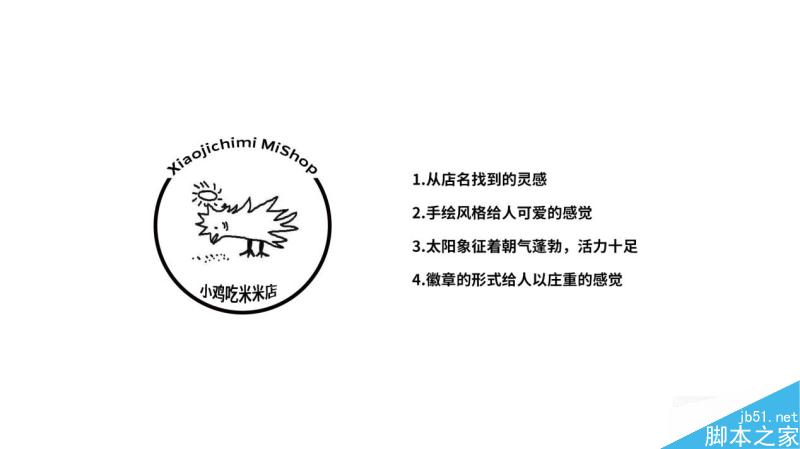 你要跟阿黃說。你看,你的店名叫小雞吃米,logo的主元素就是小雞吃米,很貼切。我采用了手繪的風格,給人很可愛的感覺。logo中還有一個太陽,象征著朝氣蓬勃,活力十足。logo整體又是徽章的形式,給人很莊重的感覺,說明你這個人很靠譜。